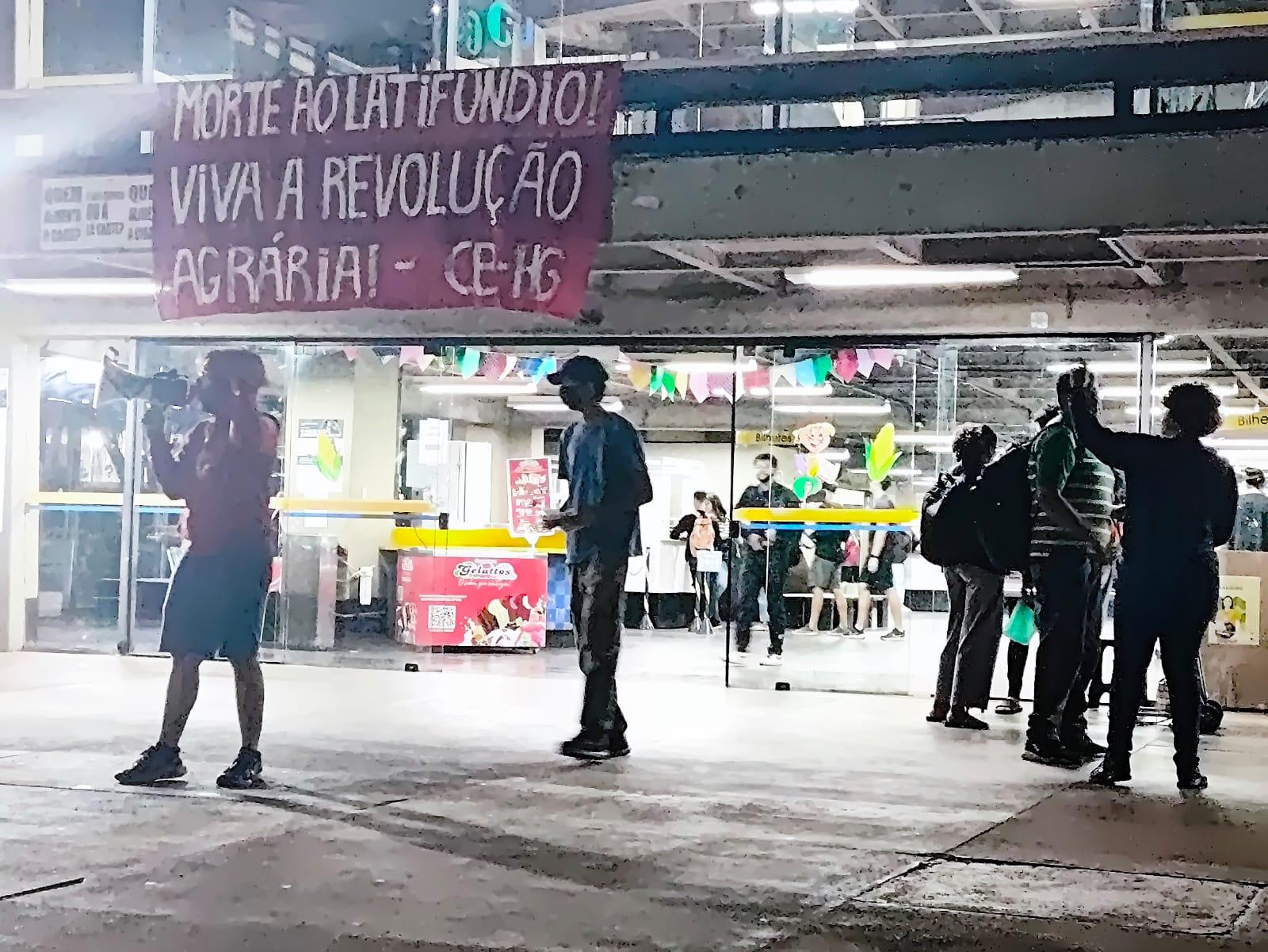 Ocorreram ainda duas agitações em frente ao Restaurante Universitário com megafone e uma faixa feita pelos estudantes do CB-HG que diz “Morte ao latifúndio! Viva a Revolução Agrária!”. Nessas agitações, os estudantes propagandearam que a luta pela terra é um tema que, apesar de central no Brasil, segue sendo apagado nas universidades que, especialmente nas cidades, fingem não haver luta pela terra no país. No entanto, mesmo em Brasília, na capital do país, há forte luta pela terra, travada pelos camponeses e indígenas, como a tentativa de desocupação do território indígena dos Boe-Bororo no carnaval e, posteriormente, dos Guajajara, durante o Acampamento Terra Livre (ATL), no qual as forças repressoras do Estado foram expulsas e escurraçadas do território pela luta combativa dos próprios indígenas. Ambas as lutas não foram denunciadas pelo oportunismo ou tiveram sequer apoio da universidade ou dos movimentos estudantis oportunistas.
