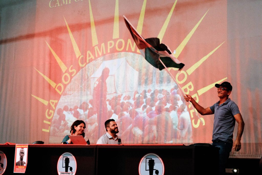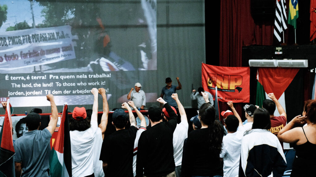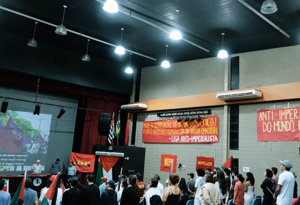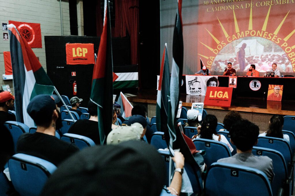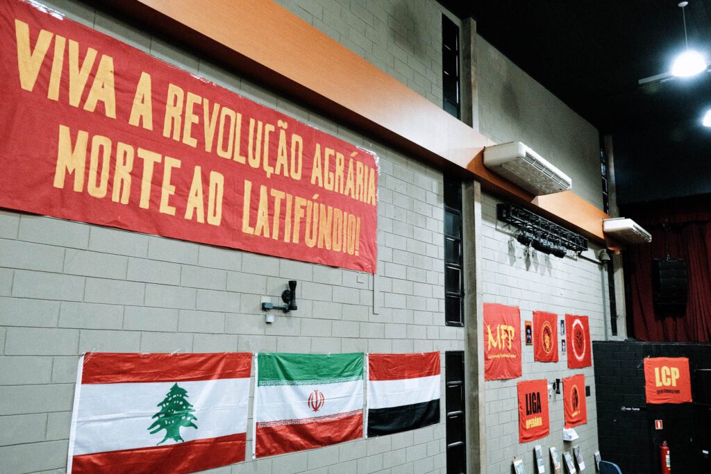 O auditório do sindicato estava repleto de faixas em apoio a revolução agrária e bandeiras de movimentos democráticos e revolucionários, bandeiras de países do Oriente Médio que sofrem a agressão do estado sionista de israel também decoravam o espaço em solidariedade a luta contra o sionismo.