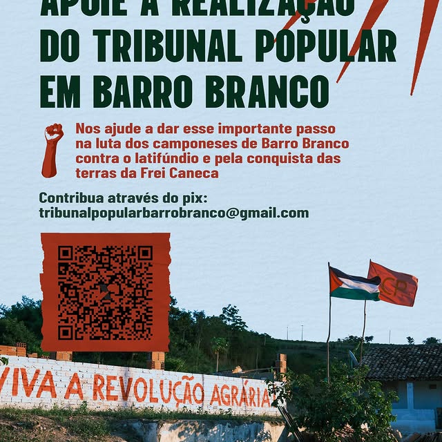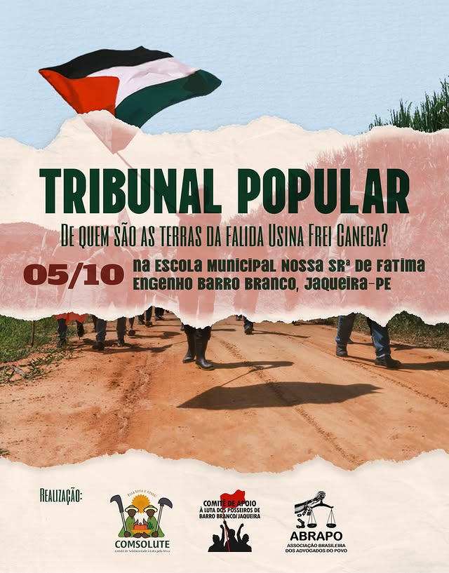 O COMSOLUTE – Comitê de Solidariedade à Luta pela Terra , o COMITÊ DE APOIO à Luta dos Posseiros de Barro Branco e a ABRAPO – Associação Brasileira dos Advogados do Povo – Gabriel Pimenta são convocados publicamente a todos a sociedade de Jaqueira, de Pernambuco, do Nordeste e do Brasil, especialmente aos democratas e progressistas, defensores dos Direitos do Povo e do seu direito de luta por direitos, e aqueles solidários à luta pela terra no País a tomarem parte e apoiarem a realização do Tribunal Popular: De quem são as terras da falida Usina Frei Caneca? , que ocorrerá no dia 5 de outubro de 2025 em Barro Branco , com o objetivo de julgar a propriedade das terras da antiga usina e os crimes cometidos pelos supostos donos e empresas arrendatárias contra as comunidades camponesas que lá vivem e produzem. Neste evento também se celebrará a passagem de 1 ano da feroz resistência dos posseiros, que repeliu bravamente o ataque criminoso de mais de 50 homens armados da “Invasão Zero”, ateando fogo na produção dos camponeses, tentando romper suas casas e atirando contra as pessoas, mas que foram barrados e expulsos, porém nunca punidos pelo judiciário.