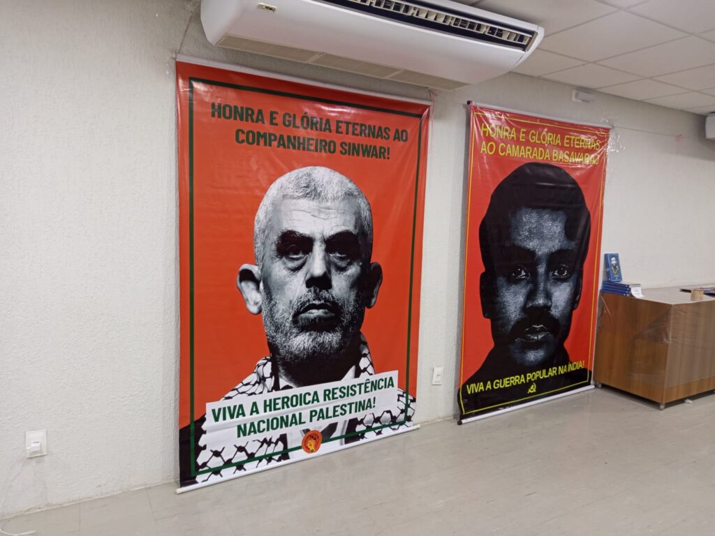 O evento se iniciou por volta das 20h30 na sede do SINTTEL, repleta de bandeiras das organizações da Resistência Nacional Palestina e um estandarte escrito “Honra e glória eternas ao companheiro Sinwar! Viva a Heroica Resistência Nacional Palestina!”, assinado pela LAI, em homenagem ao comandante em chefe do Hamas, Yahya Sinwar, tombado no fronte de guerra em outubro de 2024; e outro escrito “Honra e glórias eternas ao Camarada Basavaraj! Viva a Guerra Popular!”, em homenagem ao Camarada Basavaraj, nome de guerra do líder comunista Nambala Keshava Rao, secretário-geral do Partido Comunista da Índia (Maoista), também tombado em combate numa confrontação contra a reação indiana em maio de 2025.