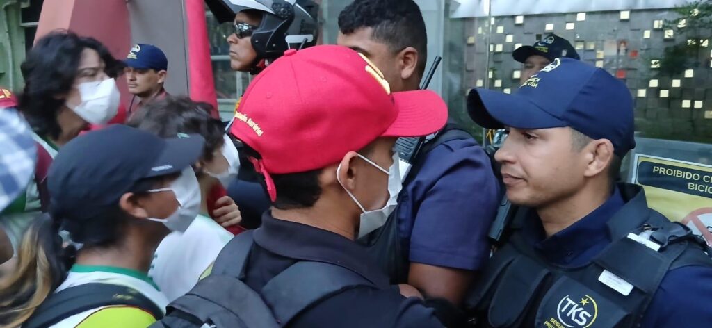 “Estamos sendo perseguidos a manifestação inteira por uma segurança privada que não tem direito algum de proibir os estudantes de acessaram seus prédios”, denunciou um dos ativistas. Diante da denúncia dos estudantes, os TKS’s responderam com ofensas e colocando a mão no coldre das armas, tudo enquanto se equipavam com coletes e cacetetes para assim que chegasse o reforço de seus comparsas, iniciassem as agressões aos estudantes.