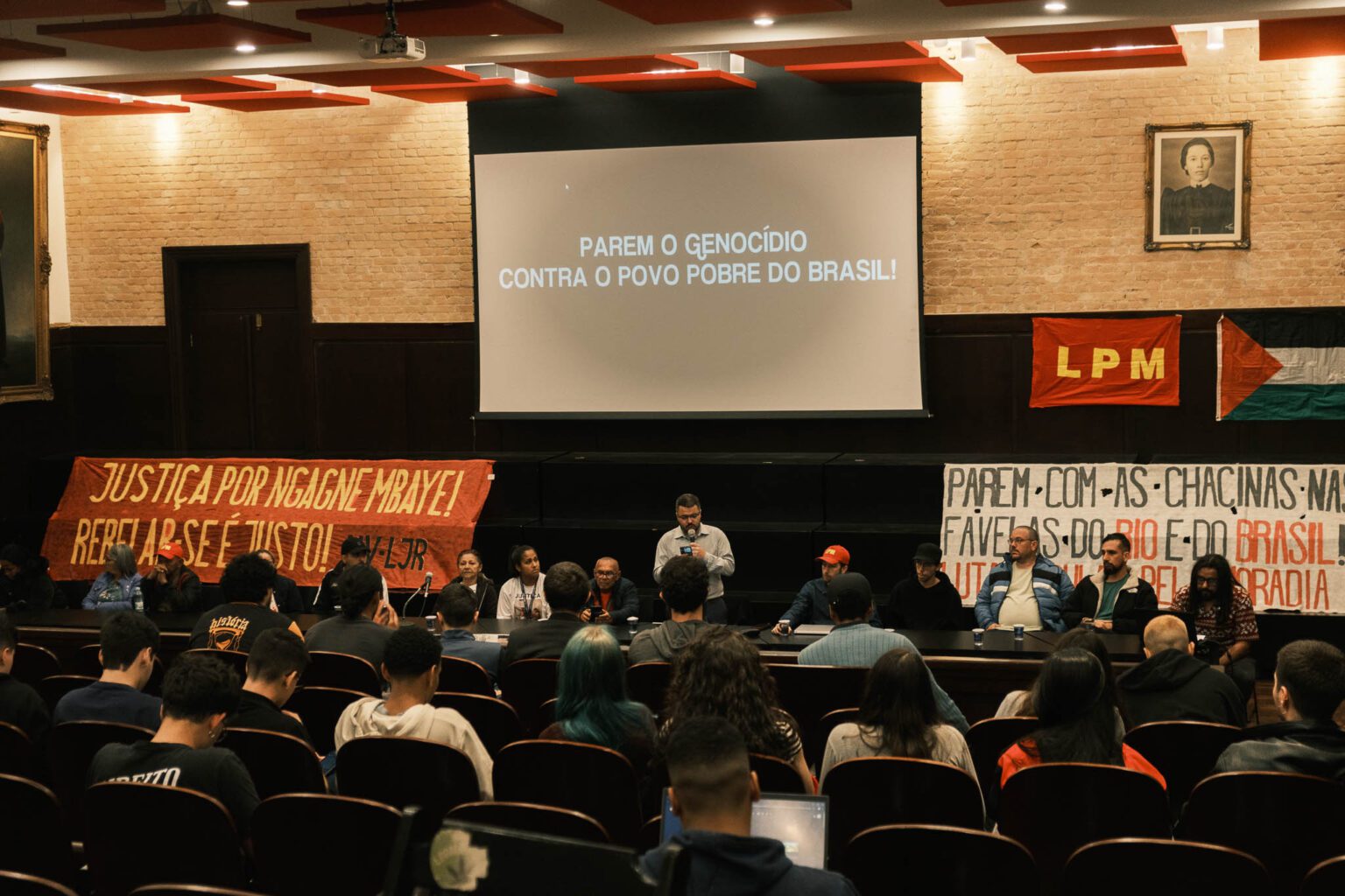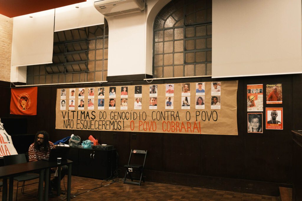 A Sala dos Estudantes, local onde foi realizado o evento, estava ornamentada com uma faixa exigindo justiça por Ngagne Mbaye – ambulantes senegalês assassinado pela PM no bairro do Brás em SP esse ano –, assinada pela Unidade Vermela – Liga da Juventude Revolucionária (UV – LJR); uma exigindo o Fim das Chacinas nas Favelas do Rio e do Brasil, assinada pela LPM, e um painel com fotos de diversas vítimas do genocídio, lembrando seus nomes e rostos para que jamais sejam esquecidos.