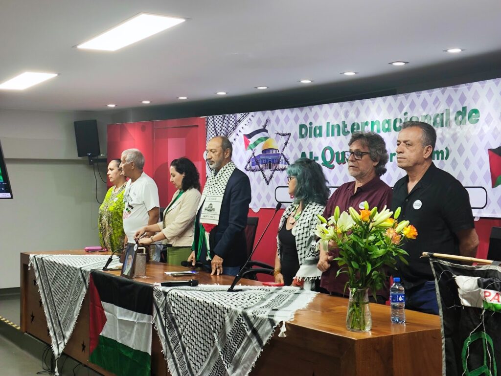 Compuseram a mesa do evento diversas lideranças políticas e sociais. Sayid Tenório, Vice-Presidente do Ibraspal, recordou que o Dia Internacional de Al-Quds foi instituído em 1979  “pelo Imã Ruhollah Khomeini, após a vitória da Revolução. E esta data foi instituída para prestar solidariedade e apoio à luta do povo palestino, mas também para tornar este evento, eventos como esse, numa ação internacional, para que a causa palestina nunca deixe de estar presente nas nossas preocupações, nas nossas pautas, principalmente agora, depois de dois anos e meio com o genocídio que o povo palestino estava sofrendo na faixa de Gaza e das agressões permanentes contra os palestinos que vivem na Cisjordânia. [Que] o mundo não esqueça desta causa, que é a causa mais relevante de solidariedade e de libertação nacional, assim como é também a causa de libertação do povo do Saara Ocidental.”