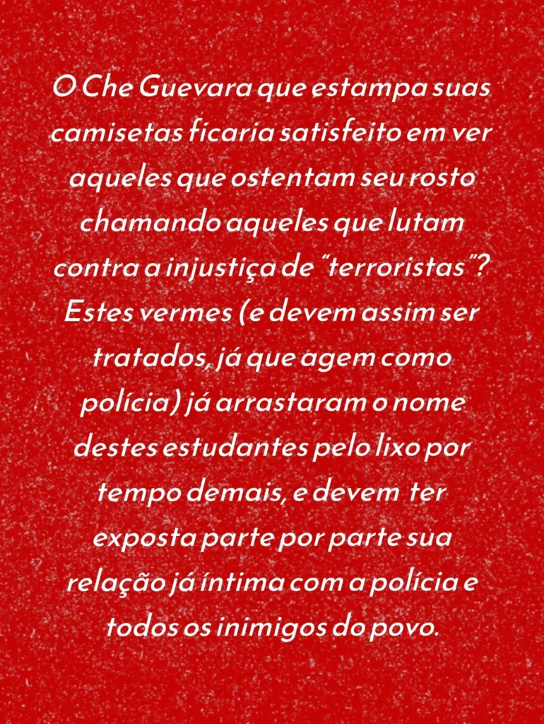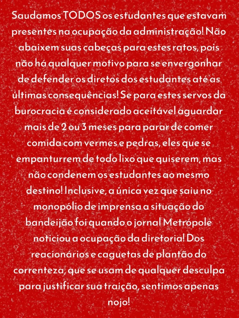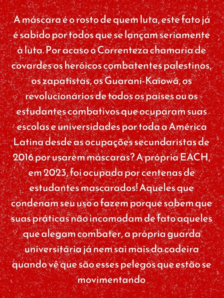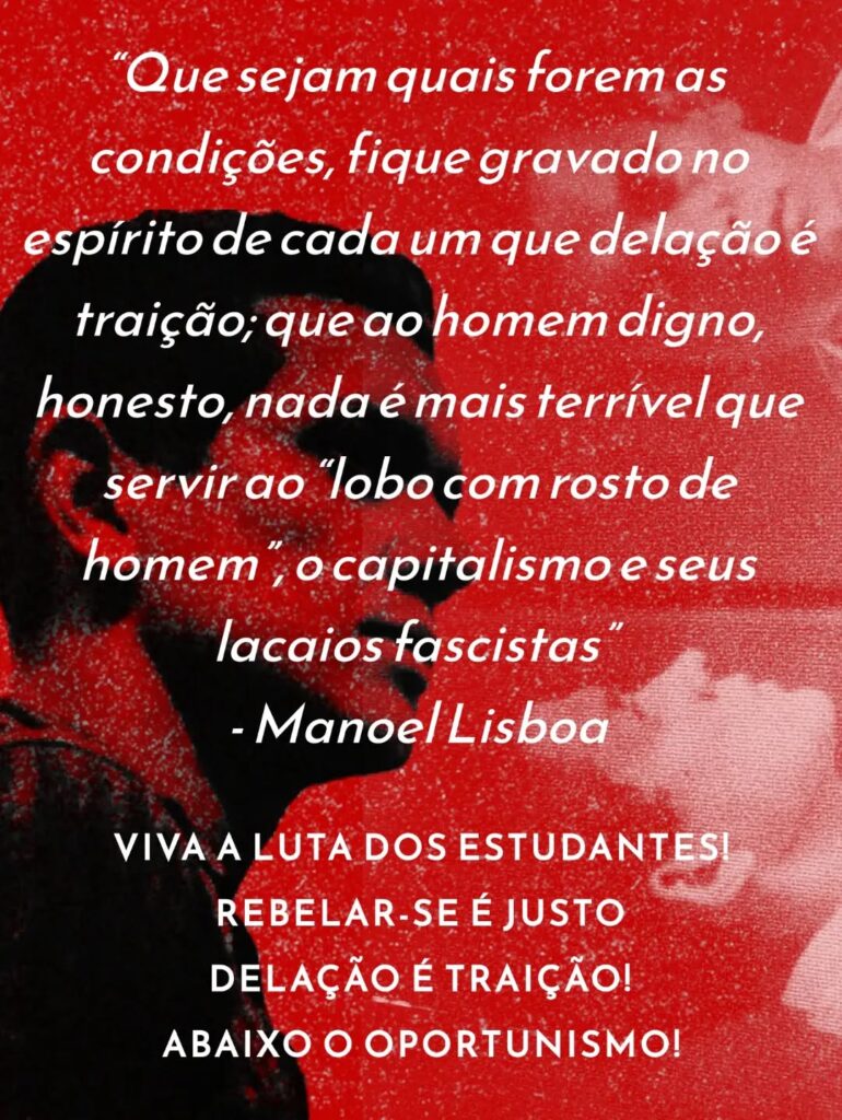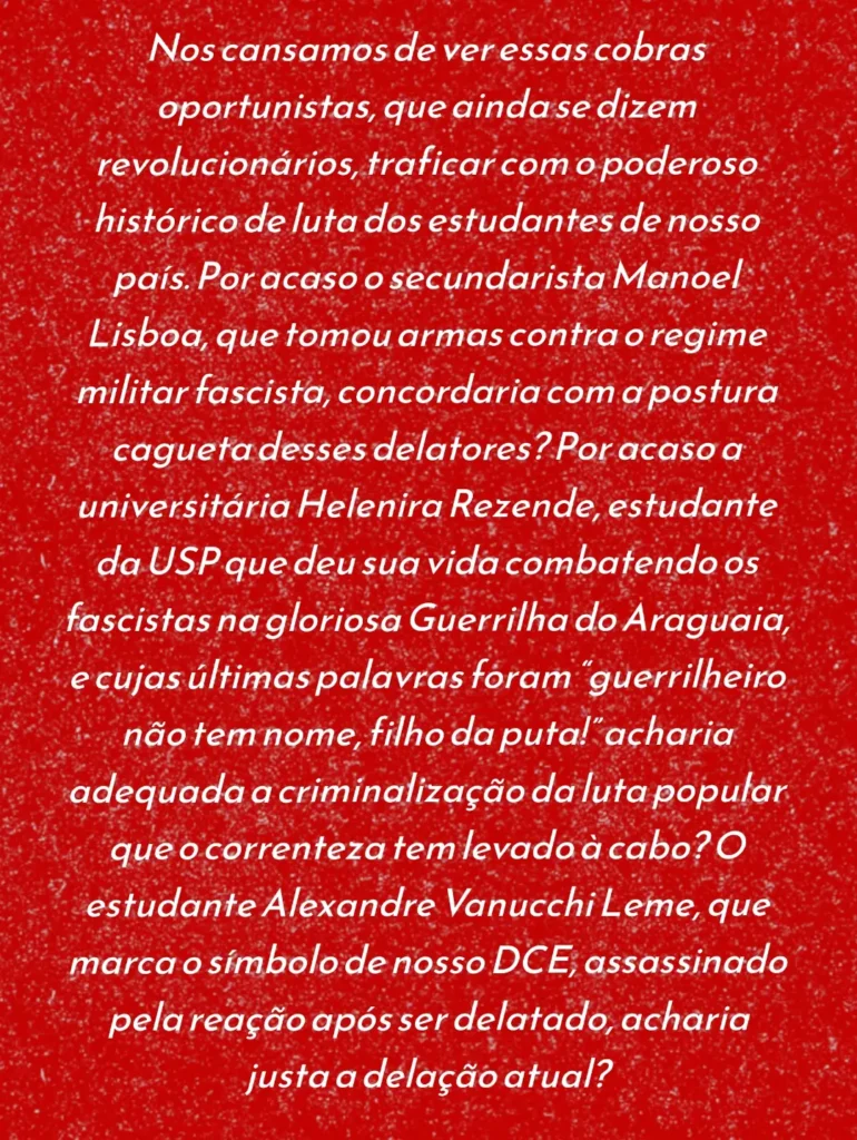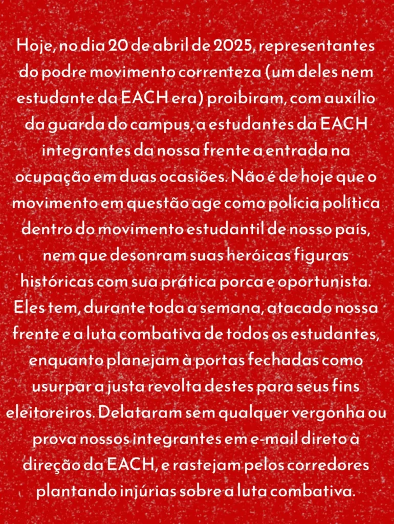 Nota inicial: Acompanhando as notícias da importante luta dos estudantes e seus desdobramentos na USP, nos deparamos com mais uma denúncia grave da Frente Estudantil Marimbondo. Após a atitude delatora de membros do Correnteza contra estudantes independentes que realizaram importante ocupação no início das mobilizações, motivo de orgulho para todo jovem e estudante que luta dia por um ensino público, gratuito, científico e a serviço do povo, agora querem proibir estudantes de participarem das mobilizações. São esses que dia e noite acusam estudantes independentes e revolucionários de serem “sectários”? Ou que estão chorando pelos cantos acusando a podre UJS de ser “desonesta” nas eleições da UNE e da UBES? Essas atitudes são deploráveis! Uma entidade histórica como o DCE da USP se submeter a esse tipo de atitude policialesca (sim, a polícia que tem interesse que estudantes não se organizem e lute) fazendo papel de cão de guarda da burocracia universitária, é jogar na lama a tradição histórica do movimento estudantil em nosso País. Em meio a essa luta tão importante, esse tipo de atitude serve somente para enfrequecer a organização dos estudantes. Nenhum estudante jamais será impedido de lutas, seja pela reação aberta ou pelo oportunismo descarado, que pousa de revolucionário nas fotos e na prática do dia-a-dia agem como verdadeira camisa de força da luta popular. É papel dos estudantes denunciarem e rechaçarem atitudes como essa! Temos plena convicção que essa atitude mesquinha e policialesca não representa a maioria dos estudantes que estão mobilizados lutando e resistindo a todas pressões e ameaças da burocracia universitária. Por isso fazemos questão de reproduzir abaixo na íntegra o posicionamento da Frente Estudantil Marimbondo retirado do seu instagram @marimbondo.uspleste.